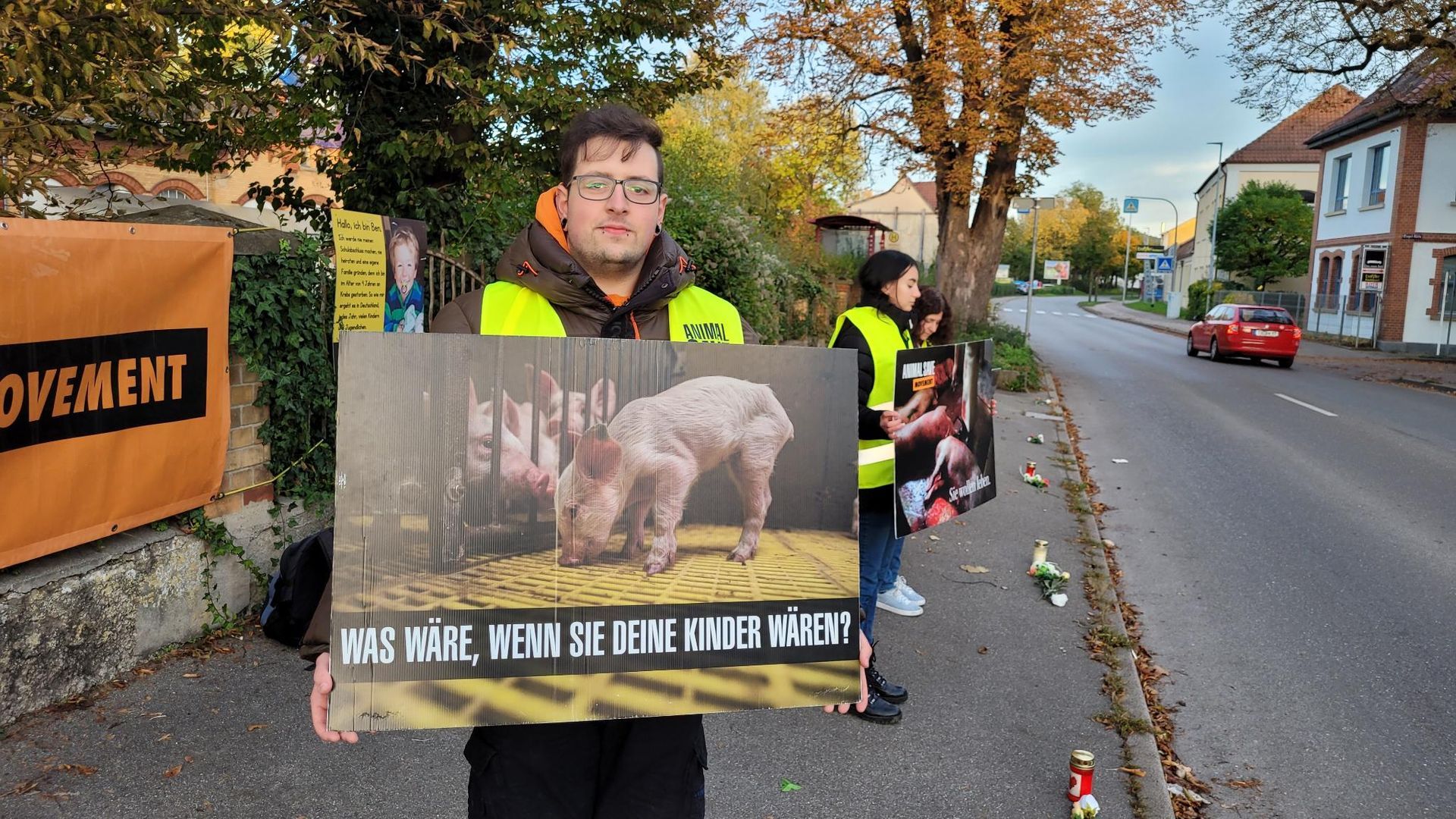 Die 47. Schlachthof-Mahnwache in Rottenburg am 19.05.2024 begann nach Abschluss des Pre-Vigil Briefings. Zu Beginn der Veranstaltung wurden die Sicherheitsstandards des Animal Save Movement vorgestellt. Die Teilnehmer*innen erhalten gelbe Sicherheitswesten mit dem Logo unserer Ortsgruppe, die jedoch noch nicht geliefert wurden und daher bei der nächsten Mahnwache zum Einsatz kommen sollen.